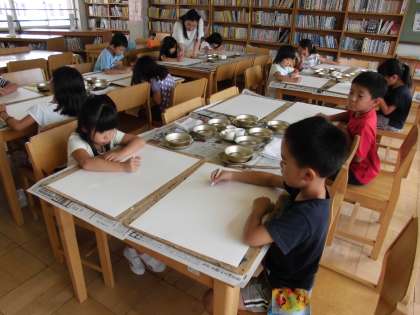 以前に本校におられた古塚先生を講師にお迎えして,「色いろラボ」と題して,絵画教室を開きました。白いクレパスで魚を描き,絵の具で彩色。水をたっぷりと使った「にじみ絵」を楽しみました。画用紙いっぱいに,たくさんの海の生き物が泳ぐ楽しい絵に仕上がりました。前期2が始まったら,全校のお友達にお披露目します。
