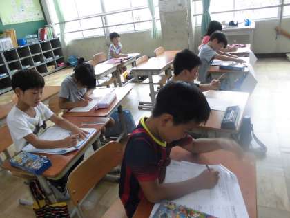 夏休みの学習相談会も,今日4日目です。朝早くから登校し,宿題やプリントなどの学習をこなしています。計算問題は,時間を意識したり,友達と競争したりと目標をもって取り組んでいます。