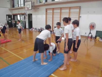 組体操の練習が始まって2週間が経ちました。今日は,一人技から三人技までを音楽に合わせて練習しました。5・6年生89名が,心を一つに真剣に取り組んでいます。6生は先輩らしい声かけをし,5年生はそのアドバイスを素直にきく姿勢が素晴らしいです。