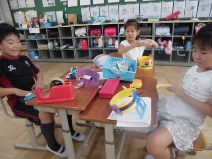 今回の図工は「わっかでへんしん!」紙で輪っかを作り,テープなどでいろいろ飾りを付けました。飾りがどんどん増えるたびに,「それ,かっこいいね。」「かわいいし,わたしも真似したいな。」と友達の作品からアイディアをもらってさらにすてきな作品になりました。