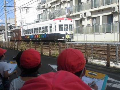 わくわくしながら探検に出発!!通るたびに車体のデザインが違う電車を見ることができて,大興奮でした。