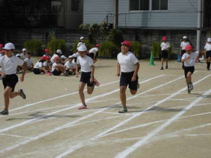 2年個人走「ジャンプ!ジャンプ!ジャンプ!」と6年 100m走の様子です。力いっぱい走っています。