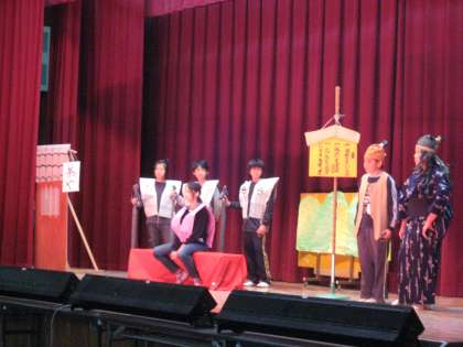 6年1組の『かしこい村物語』は,村人の知恵で役人を追い返すやり取りを,面白く演じました。