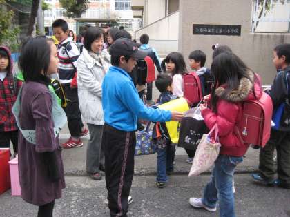 朝8時前,環境緑化委員会の子どもたちが,準備のためにやってきました。東門と南門に分かれて,回収箱を用意します。今日はたくさん集まるかなあ・・・。
