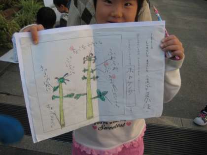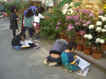 12月2日(木),小春日和の玄関前,にぎやかな声がしています。1年生が花の絵を描いているのです。その絵の上手なこと!絵を見ただけでどの花を描いているのかすぐわかります。その絵の周りには,形や色や匂いや思いがたくさん書き込まれていました。