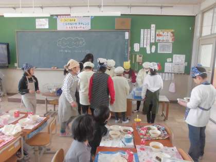 給食週間最終日の今日は,交流給食がありました。4年生は2年生と一緒に給食をいただきました。2年生の分の配膳も4年生が行いました。普段とはちがった雰囲気で食べられる貴重な時間でした。