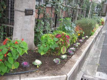 さて,いよいよグリーンベルトに取り掛かります。咲き終わった草花を抜いて,土を柔らかくほぐし,肥料を混ぜました。そこに,女性会から寄贈していただいた葉牡丹の苗を植え,その前にビオラを並べ,かわいらしく整えました。