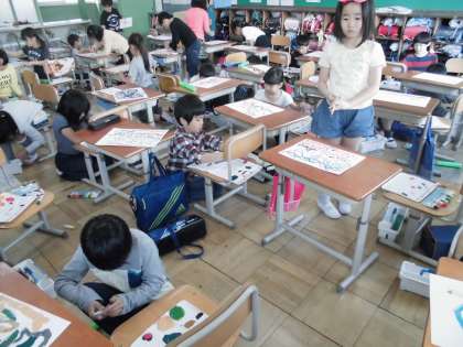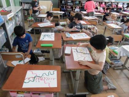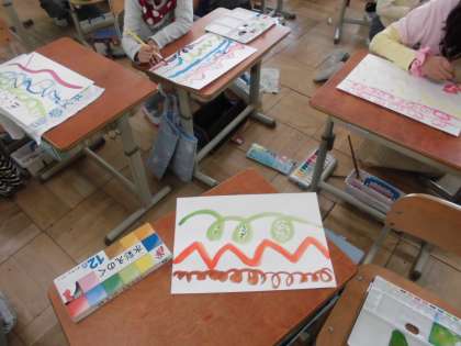 図画工作科の学習で,絵の具を使いました。色を混ぜて,思い思いの色をつくりました。水の量によって,同じ色でも濃さが変わることも学習しました。線や点を使って絵を描き,その絵に合った題名を付けました。個性豊かな作品が出来上がりました。
