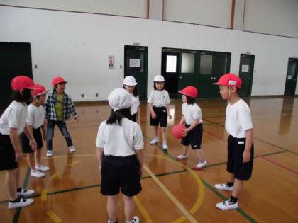 1年生の体育では,「ころがしドッジ」をしています。今回で2回目で,前回よりルールもわかってきた様子です。チームで作戦を立て,考えて取り組んでしました。
