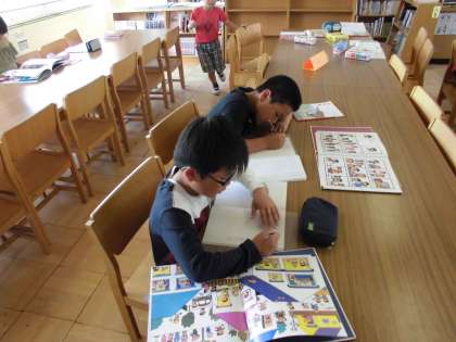 国語科では「白いぼうし」の学習をしています。登場人物の松井さんの人柄を紹介するために,図書室に人柄を表す言葉を調べに行きました。