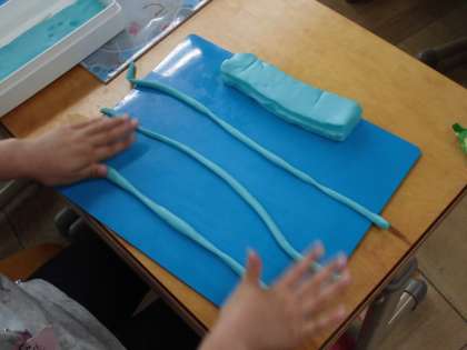 図工「ながいひもから」では,まず最初に粘土を使っておだんごを3個作りました。両方の掌を使って,上手に球形を作っていました。次におだんごを粘土板に置き,手のひらでクルクル伸ばして長いひもを作っていきます。途中で切れてしまわないように力を調節しながら注意深く長いひもへと伸ばしていきます。できた長いひもで,名前のひらがなの形などを作って楽しみました。