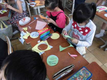 1年生をむかえる会で1年生にプレゼントするメダルづくりをしました。色画用紙に相手の名前とメッセージを書きます。そこからはそれぞれの工夫で楽しいメダルをつくっていました。1年生に3年生の気持ちが届くとうれしいです。