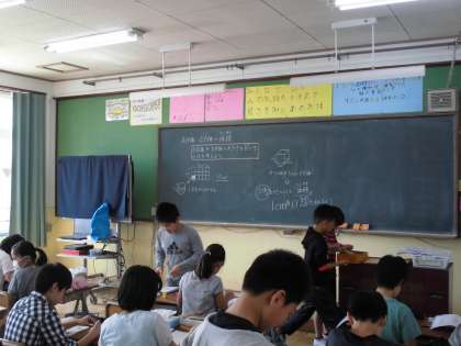算数科では,「体積」の学習に取り組んでいます。一辺が1cmの立方体を手にとって,1㎤を体感しました。その1㎤の積み木を組み合わせて,直方体や立方体の体積を調べました。