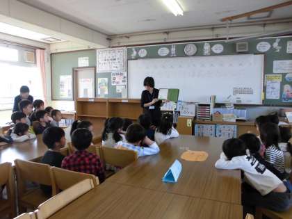 図書室の3つのやくそく「はしらない」「しずかに」「ほんをたいせつに」をみんなで確認しました。そのあとは,なかえよしを:作,上野紀子:絵「ねずみくんのチョッキ」の読み聞かせをしていただきました。