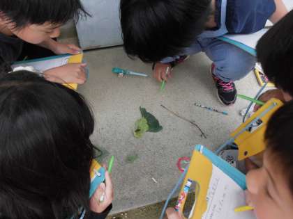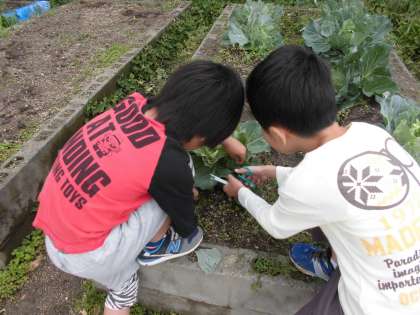 理科の学習で,チョウが育つ様子を観察するために,学校園に植えたキャベツの中からチョウの幼虫を探しました。グループで観察した後は,葉っぱを切り取って教室に持ち帰り,虫かごに入れました。これから成虫になるまで,みんなで大事にし,成長の様子を観察していきましょう。