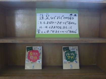 1年生から3年生までは,5月の遠足をとても楽しみにしています。図書室の入り口には「遠足の前に読む?後に読む?」と題して,遠足に関係している本が並べられています。自然に関することから,友だちとのコミュニケーションについてまで,話題はとても幅広いです。遠足の前でも後でも子どもたちが手にとってくれるのを本は待っています!