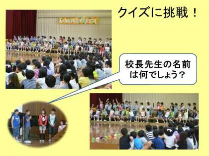 まずは,学校に関するクイズです。1年生がまず答えて,あとから2年生から6年生が答えて,教えてあげます。1年生の子ども達は,クイズに正解すると,うれしそうです。クイズの答えのあとには,ちゃんと説明がついていて,子ども達がこの朱七校のことを知ることができる工夫がいっぱいあって,すてきでした。