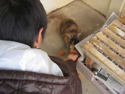掃除が済んですっきりしたら,大好きなにんじんタイム。男の子の手からにんじんをおいしそうに食べていました。