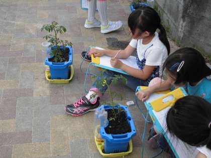 先日,個人の植木鉢に植えたミニトマトの観察をしました。苗から育てていますので,すでに黄色い花が咲いたり実ができ始めている友達もいました。毎朝,水やりをしながらたくさんの実ができることを願っているようです。