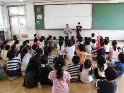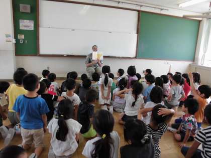 5月17日(木)中間休みに朱七ホールで,ALTのザック先生が読み聞かせをしてくださいました。