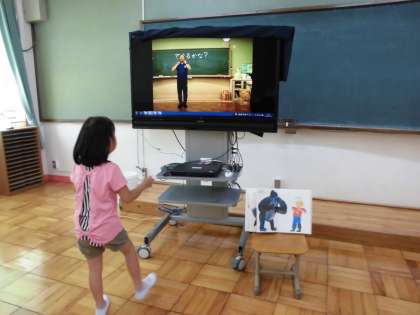 準備体操や応援合戦,いくつかの種目の練習をします。3組では,練習会でちゃんと準備体操ができるように練習を始めています。今年の準備体操はエリック・カール作の「できるかな?」の体操です。絵本でも親しみ,支部の先生や友達が体操しているDVDを見ながら練習しています。