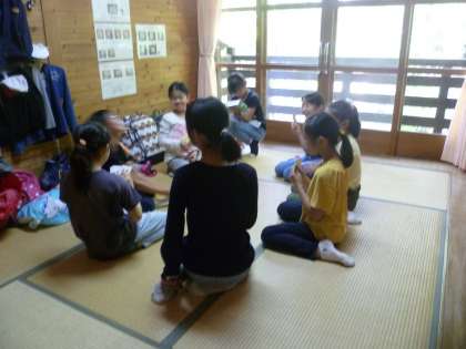 今日泊まるロッジに入って一休み。ロッジの中を探検している人もいました。荷物整理がすむと,お弁当までゆくっり過ごしていました。