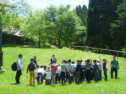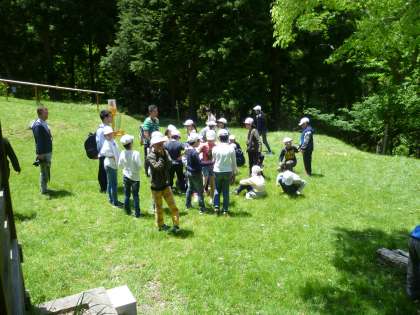 山の家の活動のスタートです。学年全員で記念写真をとりました。とても景色がきれいです。風も心地よくふいています。