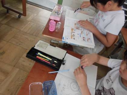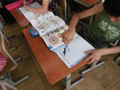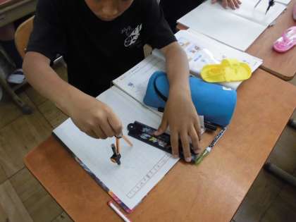 算数の学習では,コンパスを使って円を書いています。色々な半径の円に挑戦していますが,中心となる針がずれてしまったり,一周回ったところで元の線とつながらなかったりと悪戦苦闘しています。練習を積み重ねて,正確に円が書けるようにしましょう。
