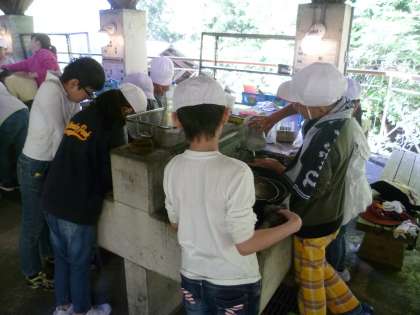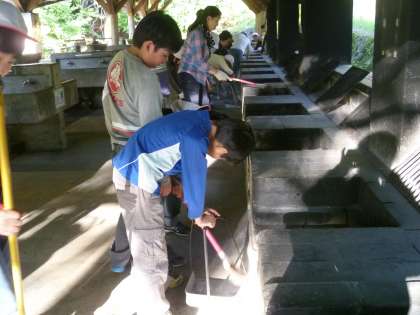 おいしいカレーをいただいた後は,後片付けです。汚れたお皿,使った鍋などをきれいに洗います。ぬるぬるするのですが,きちんと洗って片づけていました。火が消えたあとのかまどのそうじもがんばりました。