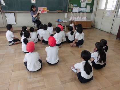 朝読書の時間に絵本のよみきかせの「ぶんぶん」さんが来てくださいました。仕掛け絵本に興味津々で,楽しそうに聞いていました。