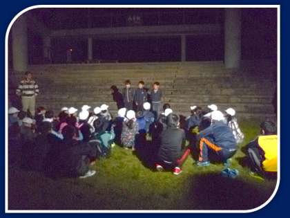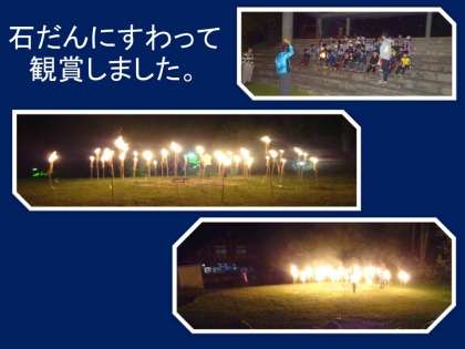 松上げ観賞の様子です。自分たちが作ったたいまつに火がともされました。15分程の素敵なショーの始まりです。火のもつ神秘さを感じるひとときでした。写真ではそのすばらしさをうまく伝えられないのが残念です。ぜひ,子どもたちから「どのように目にうつったか」「どんなふうに心に響いたか」尋ねてみてください。