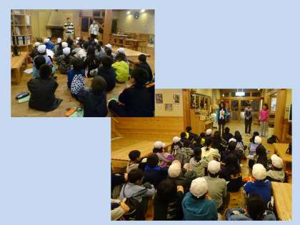 振り返りの前に、二日間お世話になった先生方とお別れしました。三人の先生方からお褒めの言葉と,この山の家の活動がもっとよくなるための宿題をいただきました。担任の先生からもこれまでの2日間を見て,あとの2日で頑張ってほしいことを話されました。