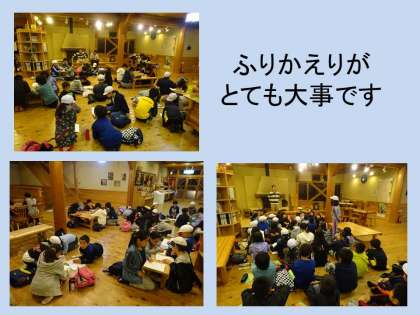 山の家の活動の間,毎日この振り返りの時間を設定しています。この時間がとても大事なのです。自分たちの決めためあてに沿って振り返らなければなりません。2日目のテーマは「自然」です。今日1日「自然」についてどのように感じ,何を学んだのか。