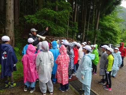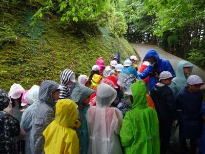 花背山の家の先生のご厚意で、雨の降り方が少しましになったときをねらって,山村都市交流の森の周辺の山に自然散策に行きました。