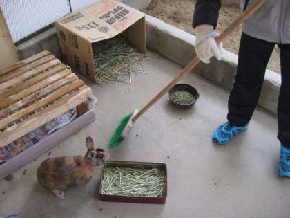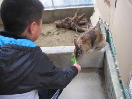 お昼を過ぎたころ,1人やってきました。飼育当番の子です。掃除が終わって帰ったと思ったら,またやって来ました。手には菜っ葉が一枚。チョコのためにわざわざ持って来てくれたんだね。ありがとう。チョコはあっという間においしそうに食べてしまいました。