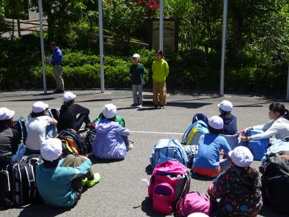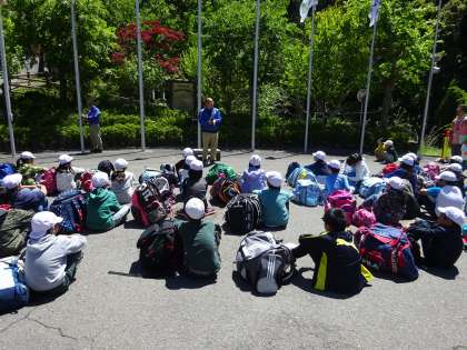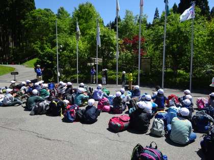 山の家の退所式を行いました。学校の旗を下ろし、山の家の方にお礼を言いました。