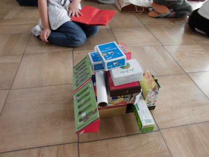 算数の授業「いろいろなかたち」の学習に使うために,いろいろな形の箱を持ってきてもらったので,その箱で好きなものを作る学習をしました。それぞれ,考えながら楽しい作品を作っていました。