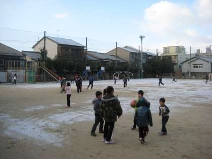 朝休み,うっすらと雪化粧した運動場では,元気に遊ぶ子どもたちの姿があふれていました。久しぶりの学校,久しぶりの友だち,うれしいね。
