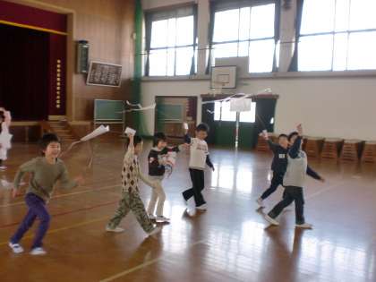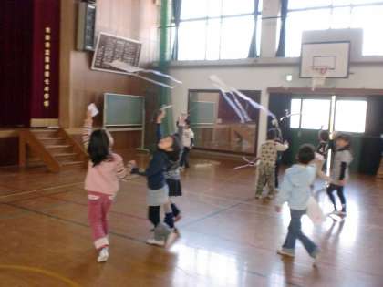 この凧は、持って歩くだけでもうまく揚げることができるので、どの子もとても楽しそうに凧揚げを楽しんでいました。