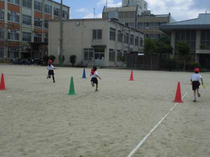 くねくねリレーでは,バトンの渡し方や走る順序などどうすれば早くゴールできるか考えながら走りました。