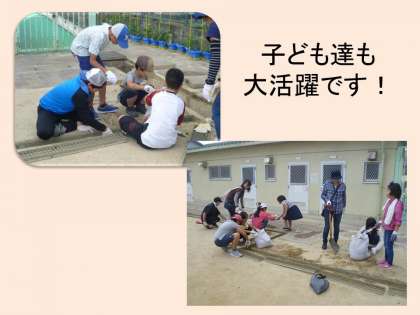 暑い中でしたが,本当にたくさんの保護者の方,そして地域の方もお集まりいただきました。人数が多かったので,予定していたよりもたくさんの溝をきれいにすることができました。花壇まわりの草抜きもしてくださいました。