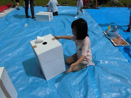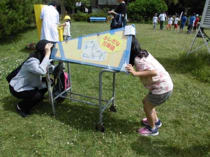 朱雀第七校はメロングループで,まずはじめに屋外学習をしました。屋外学習では,屋外園の自然に親しみながら,大型万華鏡,銀マットを使った安全おもちゃなどの大型おもちゃや記念撮影用パネルなどもありました。ボウリングゲームやチョウのお家もありました。