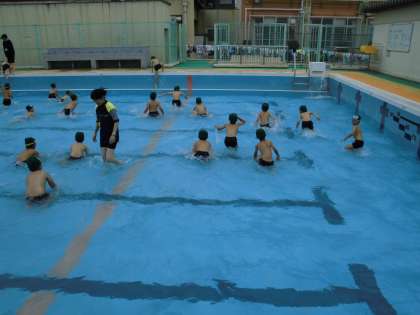 今日の体育は,水慣れの学習でした。初めてのプールでの学習に大喜びでした。1年生・2年生と一緒に学習しました。