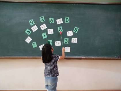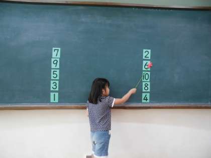 バラバラにおいてある1から20までの数字を順に目を動かして見つけていく学習や目を左右に順に動かすような学習をしています。