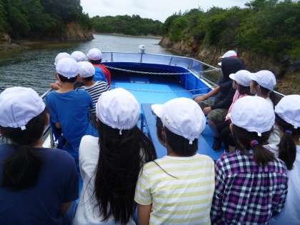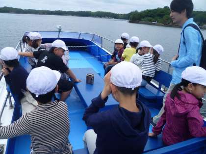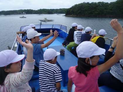 賢島から船に乗りました。風が心地よいです。船に乗ったのは初めてという子もたくさんいて,30分ほどの船の旅を楽しみました。