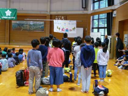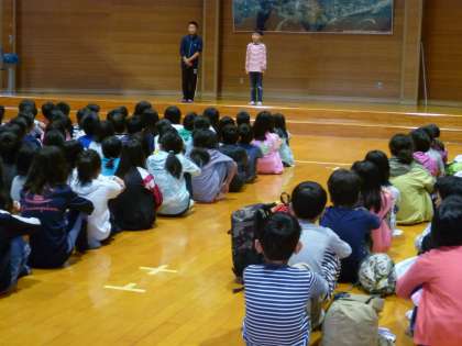 朝のつどいを3校合同で行いました。校歌を歌い,学校紹介もしました。