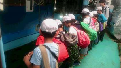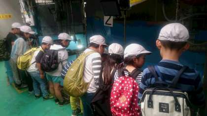 バックヤードに入れてもらいました。水槽の裏側です。水族館にいる生き物にあげるエサの説明を聞きました。その後,実際に大きな水槽の上からエサをやりました。魚がよってきて,パクリ。