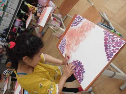 まずは,自分だけの特別の傘をクレパスで描きました。色とりどりのすてきな傘です。その後は,指を使ってスタンピングしながら紫陽花の花を描きました。
