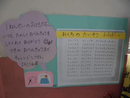 「1ねんせいのおともだちへ いつも たのしくおべんきょうをしてくれて ありがとう つぎのおべんきょうまで チャレンジしてね。よろしくね!」と書かれていました。そして,その横には「おくちの たいそう エイエイオー!」という題名の呪文のようなものが書かれていました。