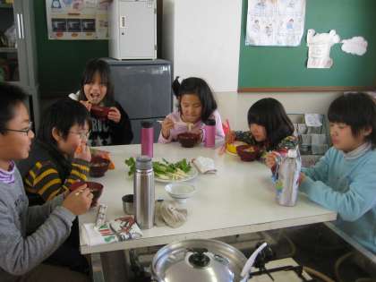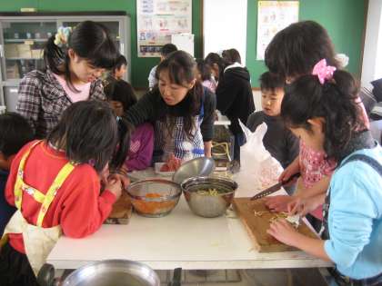 グループは,1年生から6年生までいろいろな学年が混じった6人グループ。協力しておいしい豚汁を作るのが今日のめあてです。用具を洗ったり,野菜を切ったり,だし汁を作ったり・・・大きい子は小さい子をリードし,仕事をうまく分担しながら,自分たちの力で作ることができました。